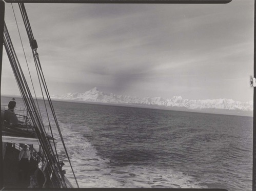 Mount Saint Elias Range from SS “Denali”. Negative #: 10755. Locality: Yakutat. Location of Negative: Wildlife Division, Director’s Office. [This information comes the reverse of the envelope for this negative #].