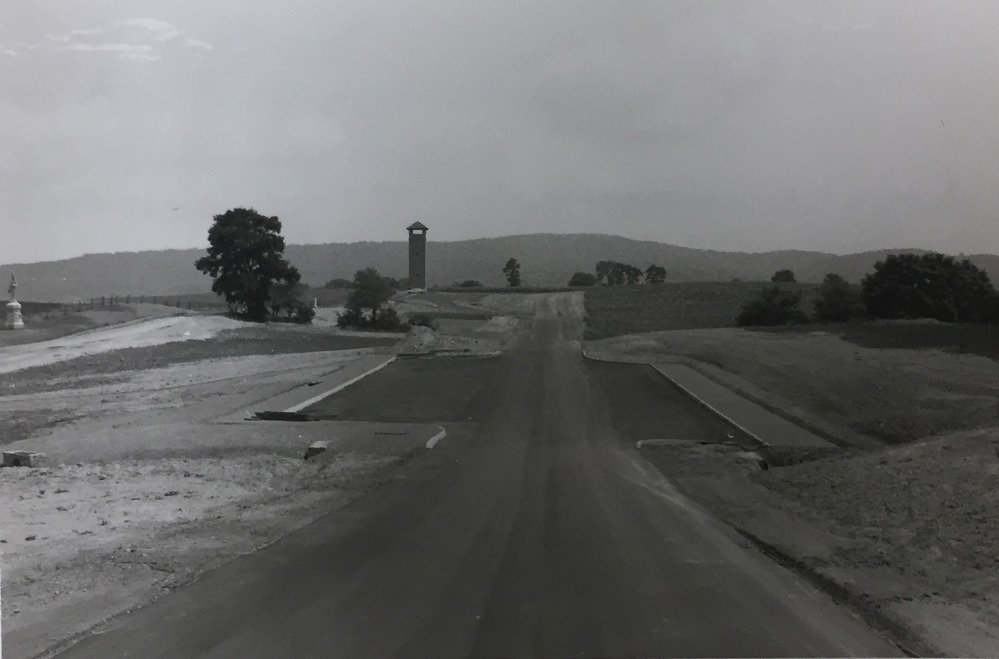 Road leading into distance with parking area in mid-ground, observation tower in center background, and hilly landscape