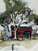 A painting of a red building with a green door on top of a hill. A large tree is beside it.