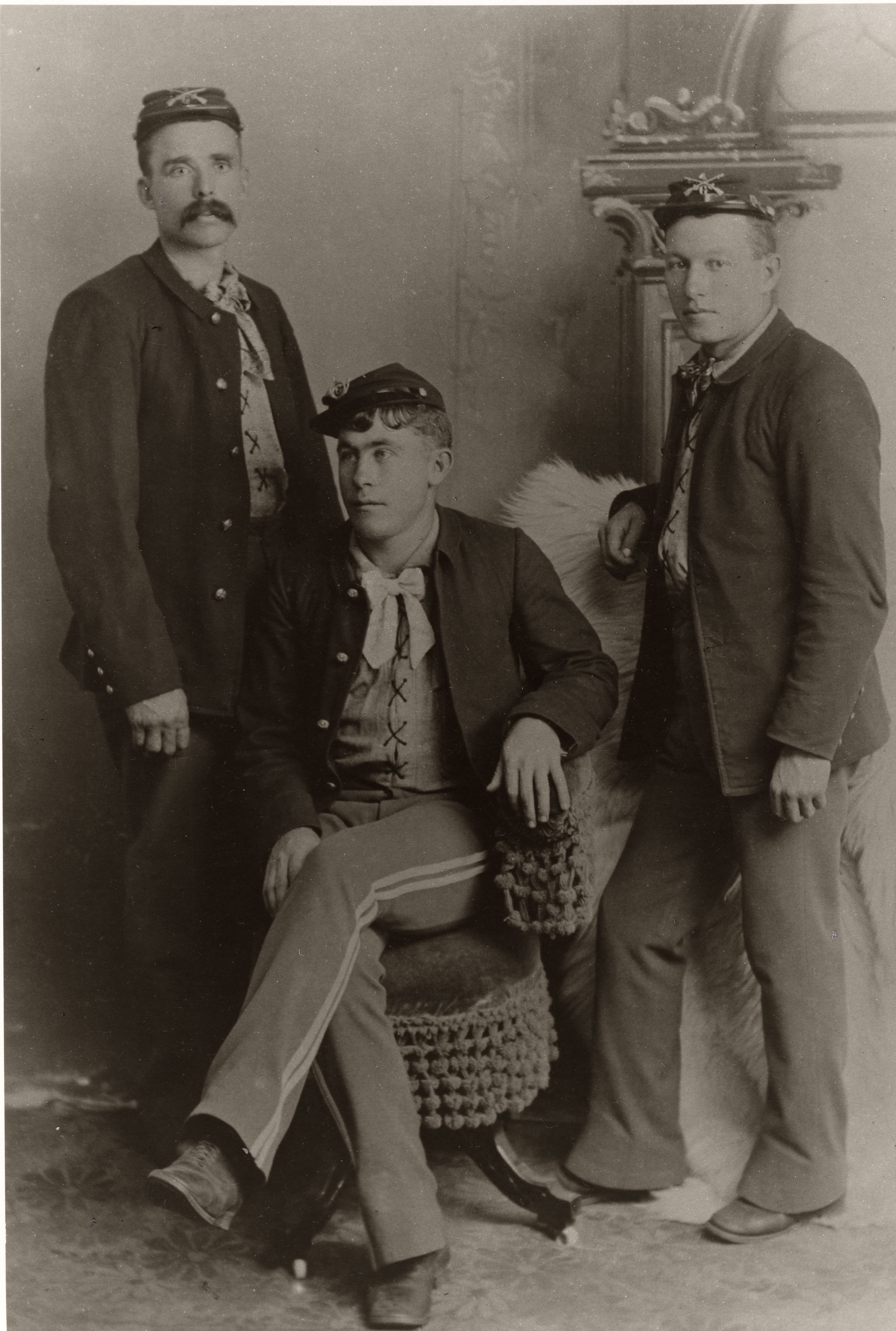 Three Fort Spokane soldiers in uniform, studio portrait; Co. G, 4th Inf. Same men as in LARO 2191. Photographer A. Hugo Albrecht. Davenport, Washington. Taken c. 1884.