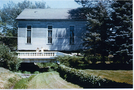Two young women pose on a small concrete rural bridge as a building being moved crosses it.