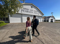 Two adults walk towards a large building with the worlds Army Air Corps Pearson Field.
