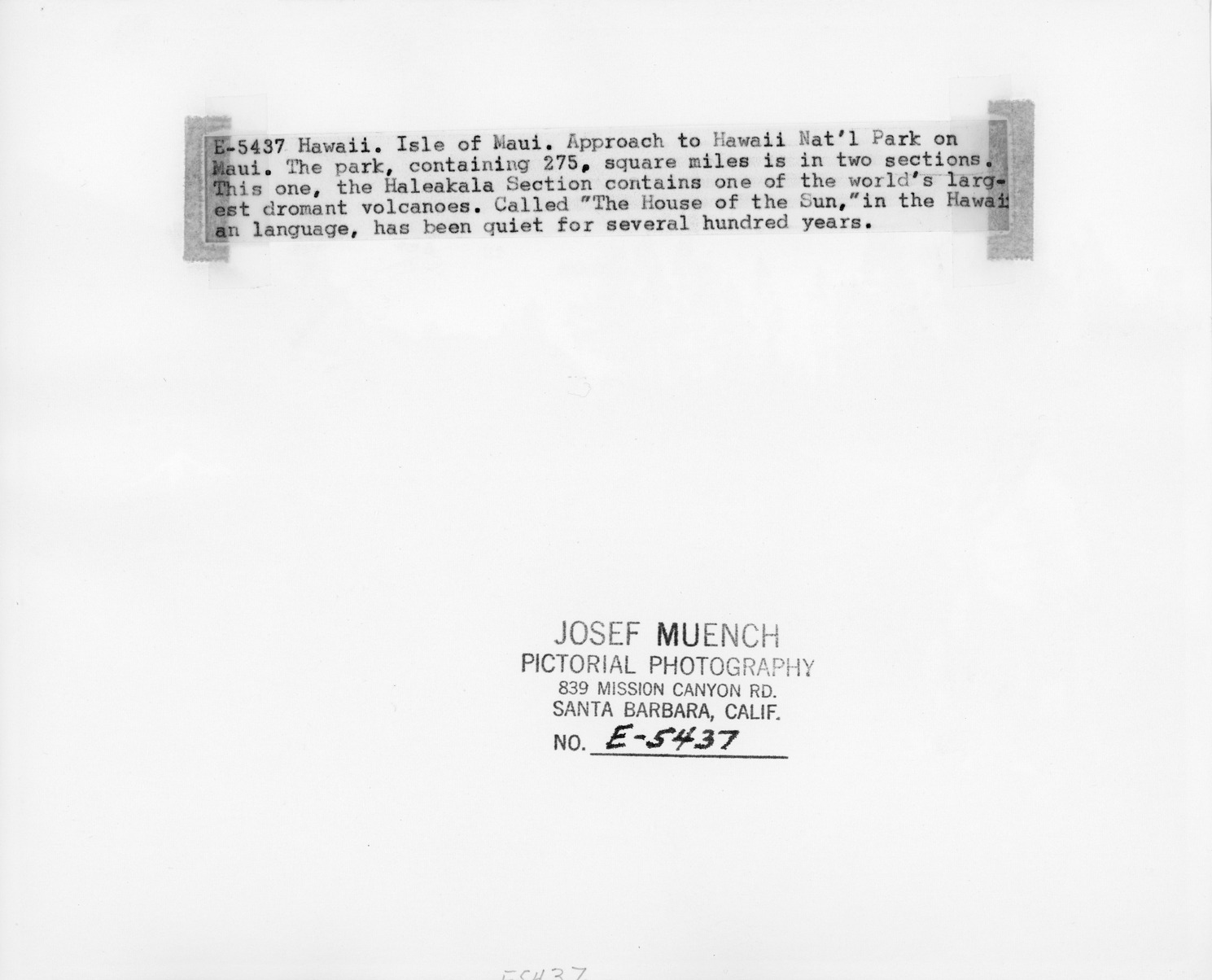 The back of the picture with the woman standing next to the entrance sign that leads into the Haleakalā section of Hawaii National Park. The back of the image has text that reads, “E-5437 Hawaii. Isle of Maui. Approach to Hawaii National Park on Maui. The park, containing 275, square miles is in two sections. This one, the Haleakalā Section contains one of the world’s largest dormant volcanoes. Called “The House of the Sun,” in the Hawaiian language, has been quiet for several hundred years.” At the bottom, it has the photographer's name, “Josef Muench,” where the image was produced, “Pictorial Photography, 839 Mission Canyon Road. Santa Barbara, California,' and the number assigned to the image, "No. E-5437."