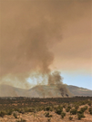 A cloud of brown-gray smoke covers the sky over the mountains and the shrub-covered mesas