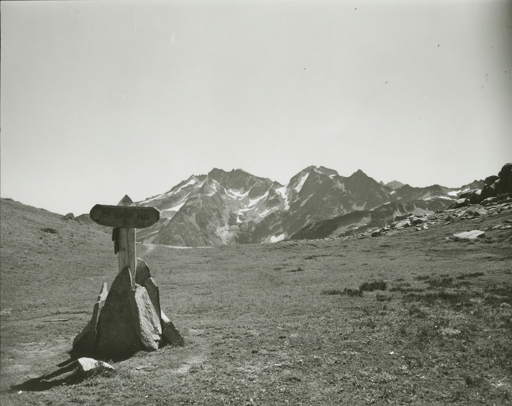 A wooden sign that says 'Cloudy Pass' on a high mountain clearing. Mountain peaks in the background.