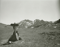 Cloudy Pass, Glacier Peak, looking east at Dumbell Mountain. ((North Cascades NPS Complex Museum Collection, NOCA.0002 Assembled Collections, Series V: 1963 NPS North Cascades Survey Photographs, Subseries A: Prints and Negatives, File 218c)