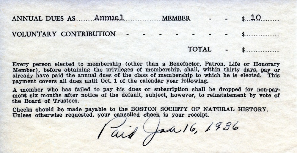Receipt from the Boston Society of Natural History for George B. Dorr's annual membership dues of ten dollars. Paid on January 16, 1936
