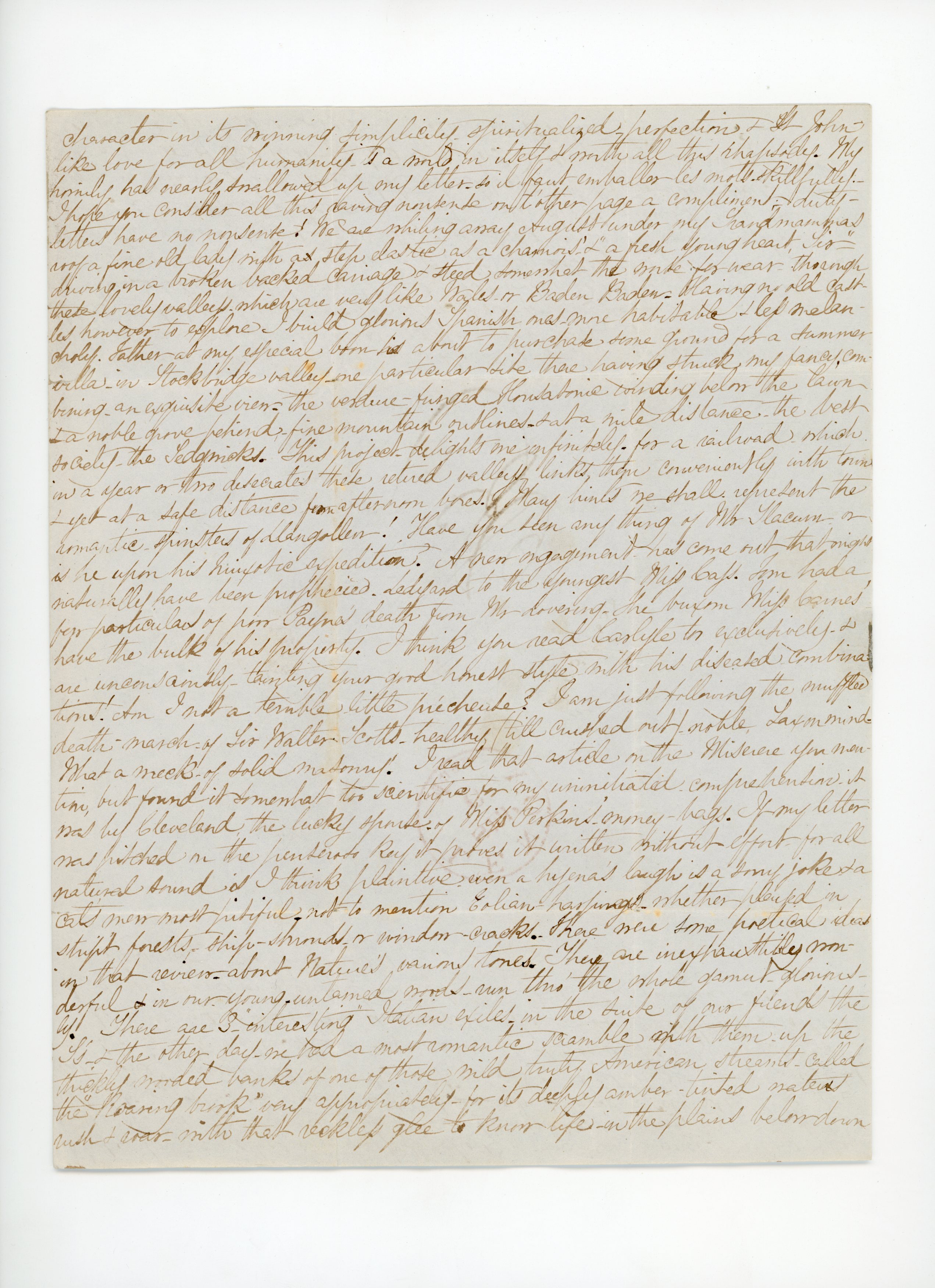 This holding converse across the Alleghanies, dear Jewett is a dot & go one’ process & reminds me of some absent old gentleman whose wits are a “slow march” & after expending a joke on them & witnessing now result suddenly in a grave subject you are startled by their electrical ill-timed hilarity. So in letters – our friend is constantly catching our mind by the skirts – or rather clothing himself benevolently in our cast-off inner garments – for the mind changes its ‘nuance’ every moment & the acme of letter-writing would be to prophecy by calculations from its previous phases what mood our friend thoughts will show at the time the ambassador of ours knocks at his door. The moment this white-robed messenger – your latest thought-full letter was red by me it kindled many responses – on which delay & circumstances putting the extinguisher to the next day or week that were faintly flickering ashes which I could or would not re-Fan so lend me our mosaic of intention for Acherontic pavement – those of maidens I trust at least are marble pure, literary ones lapis lazuli; old maids jaune-antique &c. Now, your mental spectacles may have shifted from the somber purple or grey they then wore to couleur de rose & an echo of what was may be unrecognizable or it would be very like that guessing game “what’s my thought like” or the Edinbro’ & London clubs game of chefs alternate “moves” travelling post. I have a vague remembrance I thought of preaching you a slight homily on contentment – having practical knowledge of the causes of the disease. Par parenthese I will say you have put yourself in the worst atmosphere for a cure Nature rejects violent reactions – fever & ague contrasts - & to the mind Italy & Cincinnati are a most ill-mated couple to inhabit & influence the temple of our thoughts – if not at once – before it has been swept clean & garnished ‘by older associations & gradual shifting of its furniture; - no Yankee papering on the walls with frescos on the ceiling! (like Aunt Sam’s drawing-rooms.) The first Protestanized Cathedral I remember I saw in Switzerland after crossing the Simplon & its bare despoiled look shocked one dreadfully – but what would it have [p. 2] been if I had entered instead a Yankee meeting-house! so America saxon-plain as are its best pretentions why seek the outskirts of civilization – the raw material – why weave your web – (out of compliment to your pet simile) of tow – since you cant [sic] have ‘cloth of gold’-? silk & satin are better – if not so wearable at least allow yourself a fringe or some embroidery thereof (you see how I feminize {coining words is next to coining ideas} the ‘stuff your dreams are made of.’ Therefore we rejoice as would all your well-wishers that you remove to N. York - & if you can win a spinster to weave for & with you ‘tant mieux’ for your mental tapestry! Will American-Michael Angelos-to be – paint Fate at a distaff or a greasy loom, steam-turned think you? If I were an upholsterer’s daughter I could not garnish my letter with more woollen [sic] drapery; as I am a manufacturer’s it is excusable I hope. From this beautiful valley – I look down upon – with its graceful mountains – reflecting every smile & frown of Heaven-, its brooding quiet, its elms of untaught grace, its fresh young atmosphere, its republican loud-chirping crickets - & luxuriant vegetation form under a free sky I dare not think of Europe & sigh that all here is barren. Thank God Nature is partial to no country – there is more beauty everywhere than life can fathom or exhaust - & what are Cathedrals & pictures & music but Man’s poor imperfect mockeries of God’s glorious forest-arches, - living, ever-out-Clauding Claude – creations & orchestras – (to this scene-shifting) which angels lean to hear. Grisi is one nightingale applauded by a world; millions. unapplauded but by God’s heavenly choir are covered by forest-leaves – these leaves – composing better dirges than Beethoven – the trees they covered operas to which Rossinis are as ‘squeeking [sic] of a wry-necked fife. Allyne Otis trotting with me on Nahant beach looked at the eternity of waters & sighed over them for the Italian Opera with Nature’s La blache, the sea, thundering in his ears! So our mind dwarfs itself [crossed out: instead] to art instead of listening to immortal teachers. I fancy Art is more to you than Nature – (this is a polite sequitur to the foregoing!) I know you call that God’s art – but if we are to become god-like we must learn to love that divine workmanship – looking on meanwhile with pleasure but not all-engrossing adoration upon Man’s infantile strivings – to create – Frankenstein-men ombres-Chinoises – idols of brass whose feet are clay. To me such Nature as I now enjoy is an equivalent & teaches true content – especially the nature of refined minds & noble hearts such as beat 6 miles from me now & under the same roof a few nights since. Miss Sedgwick is now my Rome, my Raphael my Italy – her mind is a better gallery than the Louvre – her heart – a purer fountain than the Trevi – a more abiding sunlight than haunts Pausillippo! Her [p. 3] character in its winning simplicity – spiritualized-perfection & St John-like love for all humanity – is a world in itself & worth all this rhapsody. My homily has nearly swallowed up my letter – so il faut emballer les mots skillfully. – I hope you consider all this raving nonsense on t’other page a compliment; - duty-letters have no nonsense! We are whiling away August under my Grandmamas roof a fine old lady with as step elastic as a chamois’ - & “a fresh young heart, Sir” – driving in a broken backed carriage & steed somewhat the worse for wear – through these lovely valleys. which are very like Wales – or Baden Baden - Having no old castles however to explore I build glorious Spanish ones – more 