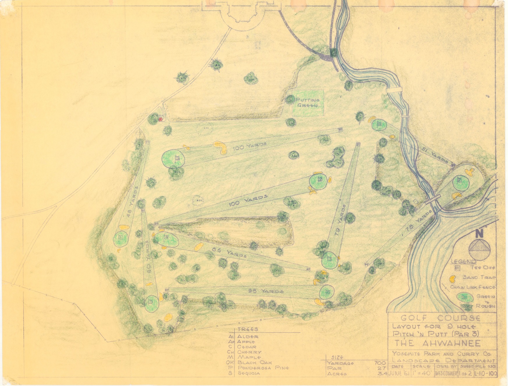 Hand colored drawing of the layout for the Ahwahnee Hotel Pitch 'n Putt golf course