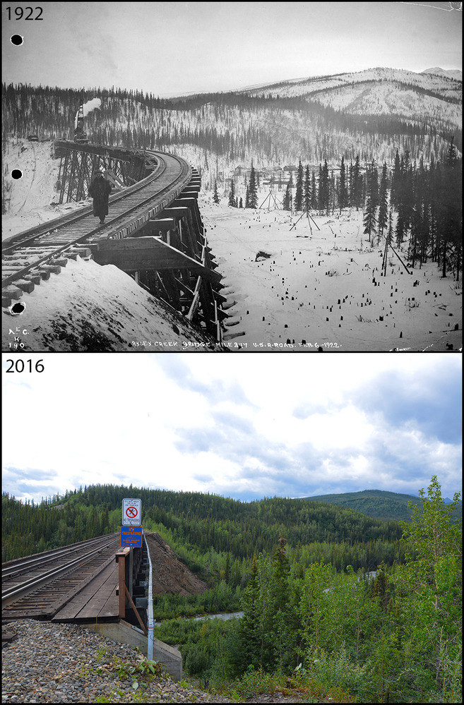 Original photographer: H.G. Kaiser (Alaska Engineering Commission Collection, Anchorage Museum at Rasmuson Center); Rephoto photographer: Jedediah Brodie
