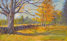 A painting of a meadow with a stone wall. There are several trees along the meadow with orange and green leaves.
