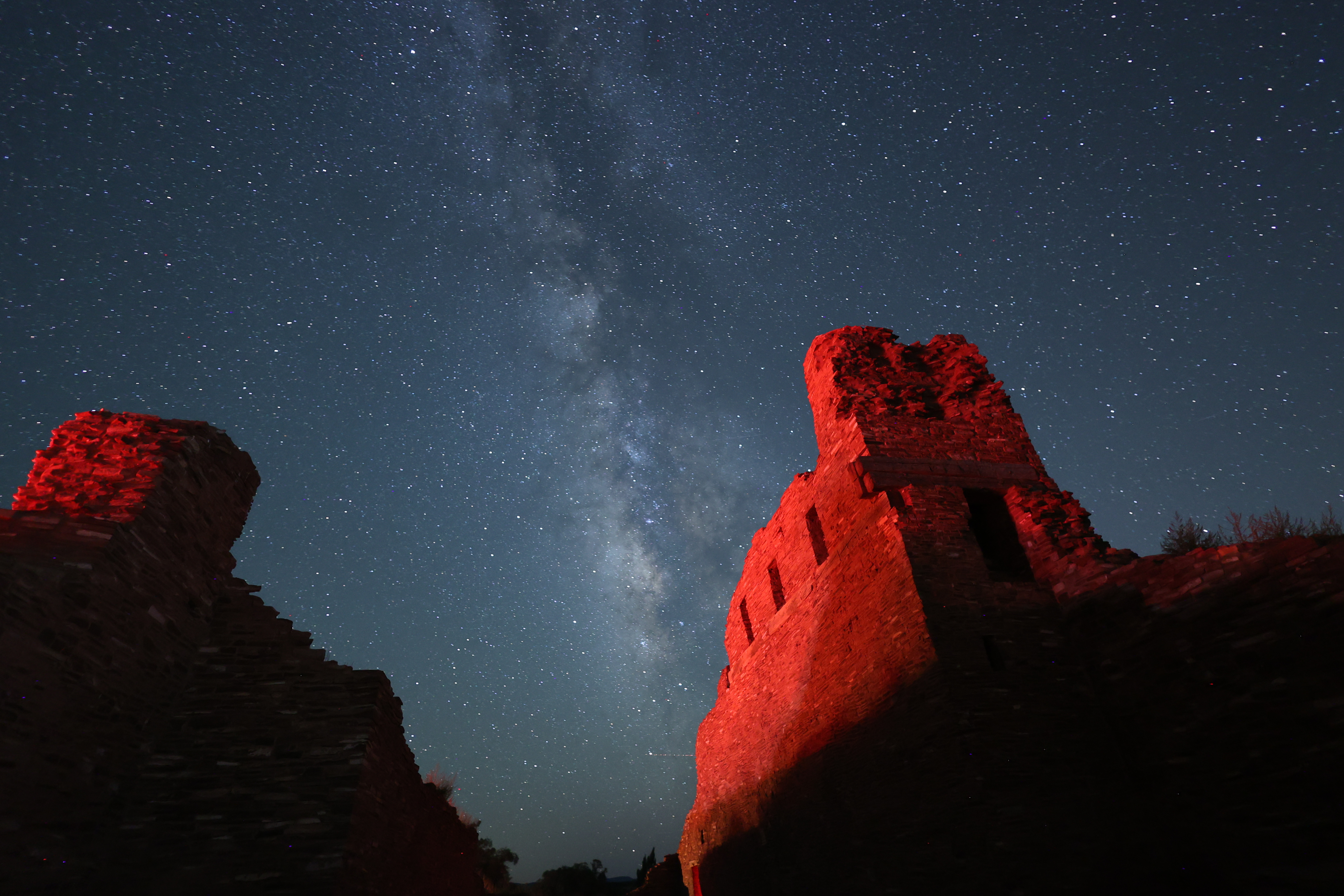 Milky Way in a starry sky with red sandstone church remnants in the foreground.