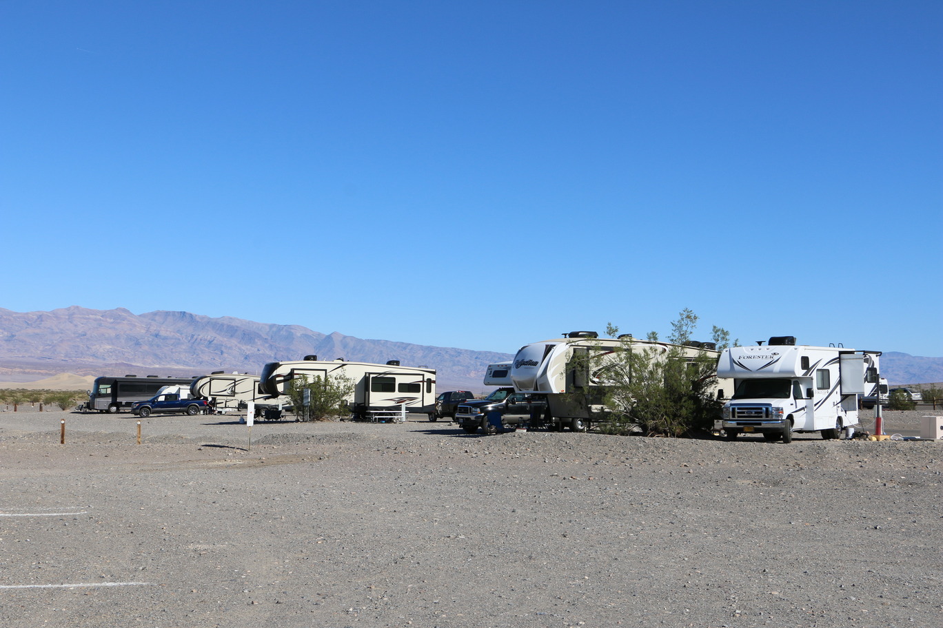 Sunset Campground Campsite. 4 Large RVS parked on a slightly uneven gravel lot with mesquite bushes sparsely in between them.