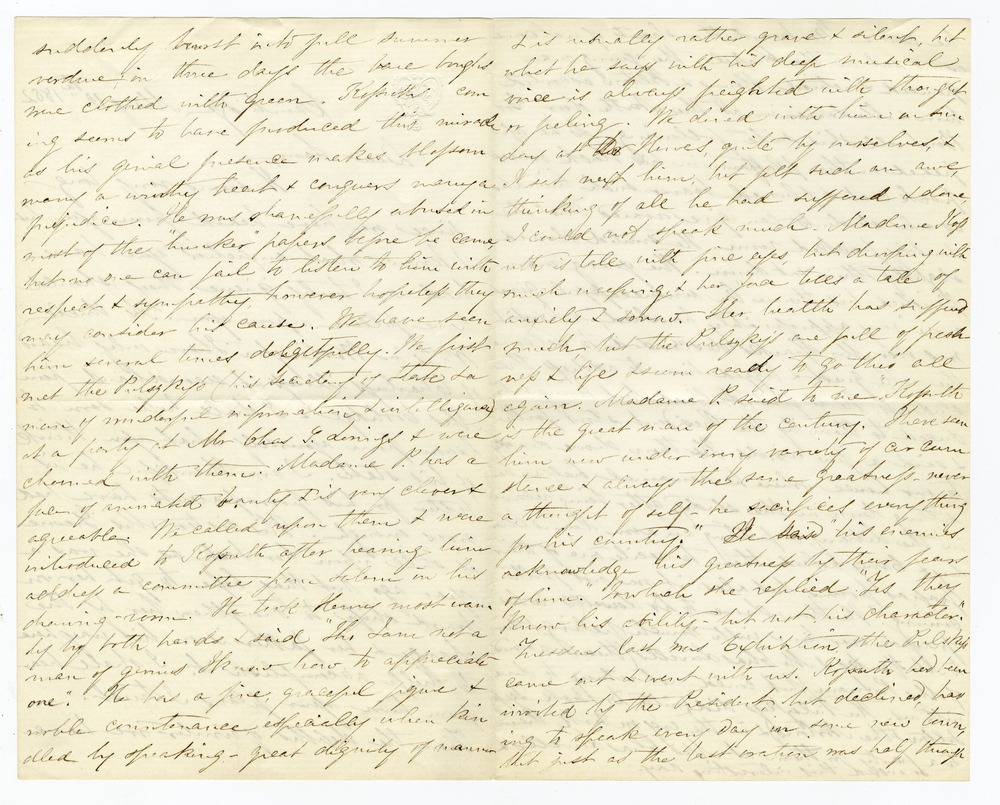 From the depth of winter we have [p. 2] suddenly burst into full summer verdure; in three days the bare boughs were clothed with green. Kossuth's coming seems to have produced this miracle as his genial presence makes blossom many a wintry heart and conquers many a prejudice. He was shamefully abused in most of the ''bunker'' papers before he came, but no one can fail to listen to him with respect & sympathy, however hopeless they may consider his cause. We have seen him several times delightfully. We first met the Pulszky’s (his Secretary of State & a man of wonderful information & intelligence) at a party at Mr Chas G. Lorings & were charmed with them. Madame P. has a face of animated beauty & is very clever & agreeable. We called upon them and & introduced to Kossuth after hearing him address a committee from Salem in his drawing-room. He took Henry most warmly by both hands & said, "Tho I am not a man of genius, I know how to appreciate one." He has a fine, graceful figure & noble countenance, especially when kindled by speaking – great dignity of manner [p. 3] & is usually rather grave & silent, but what he says with his deep musical voice is always freighted with thought or feeling. We dined with him on Sunday at Dr Howes, quite by ourselves, & I sat next him, but felt such an awe, thinking of all he had suffered & done, I could not speak much. Madame Kossuth is tall with fine eyes, but drooping with much weeping, & her face tells a tale of anxiety & sorrow. Her health has suffered much, but the Pulszky’s are full of freshness & life & seem ready to go through all again. Madame P. said to me, “Kossuth is the great man of the century. I have seen him now under every variety of circumstance & always the same greatness – never a thought of self – he sacrifices everything for his country.” I said, "His enemies acknowledge his greatness by their fears of him." To which she replied, “Yes they know his ability, but not his character.”