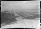 Looking north from the top edge of the Lyell glacier showing in left foreground the arete separating Maclure and Lyell glaciers and lakes below the glaciers. the glaciated Lyell canyon extends off to the left to Tuolumne Meadows, beyond which Conness and other northern peaks amy be seen.
