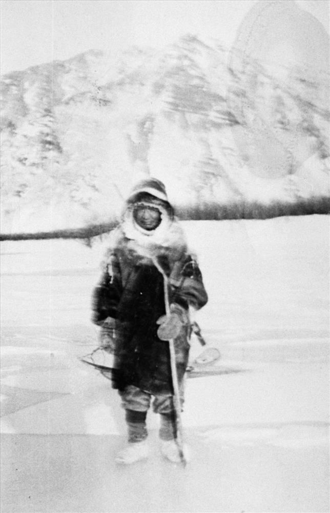 Cap Adolphus standing on the frozen Yukon River, Yukon-Charley Rivers National Preserve, 1935.