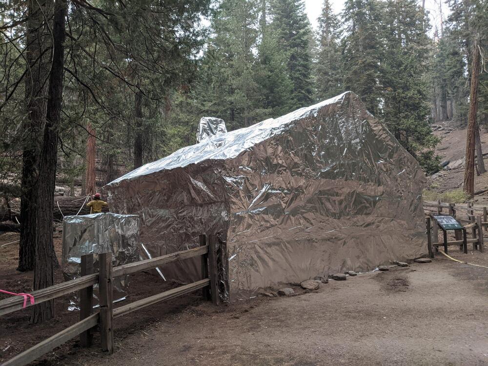 The historic Gamlin Cabin, in the Grant Grove area of Kings Canyon National Park, was wrapped in fire shelter material to protect it from the KNP Complex Fire.