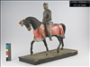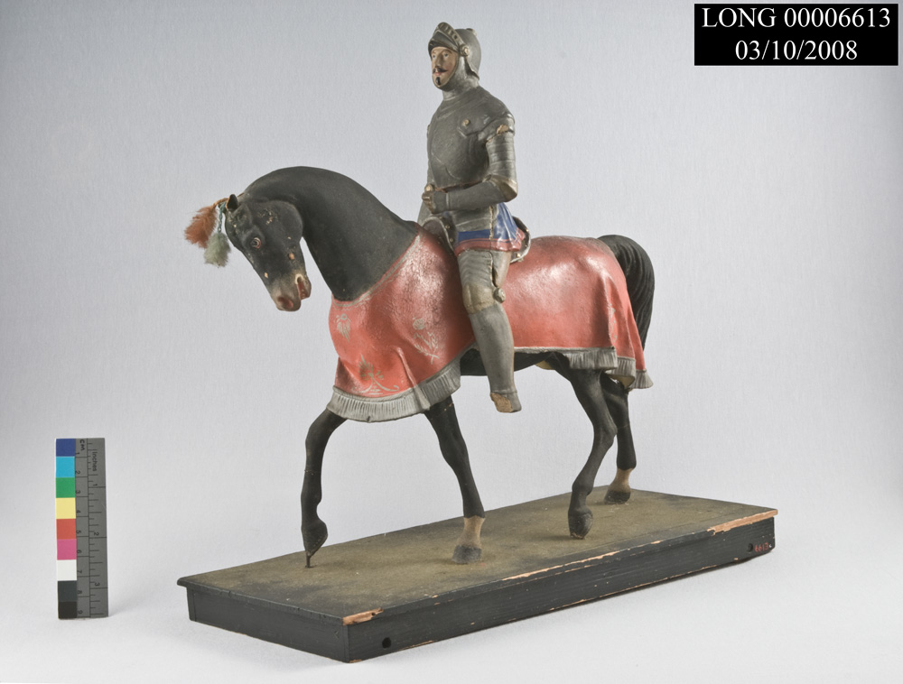 PAINTED PAPIERMACHE FIGURE OF A KNIGHT ON HORSEBACK. KNIGHT IS DRESSED IN FULL SUIT OF ARMOR AND IS DETACHABLE FROM HORSE. HORSE IS DARK GRAY W/ RED DRESS BLANKET, TWO WOOLEN HEAD PLUMES, AND A BLACK RECTANGULAR WOODEN BASE. BASE IS ATTACHED TO HORSE AND HAS FOUR SMALL WHEELS ON BOTTOM (FRONT PAIR MISSING).