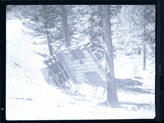 Nitrate negative of motor vehicle accident with overturned truck off road in forested area of BRCA. ; BRCA Museum and Archives Image BRCA8875_001_347 ; BRCA 8875