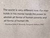 Black letters against a gray grainy background: "The world is very different now. For man holds in his mortal hands the power to abolish all forms of human poverty and all forms of human life. - President John F. Kennedy, Inaugural Address, 1961"
