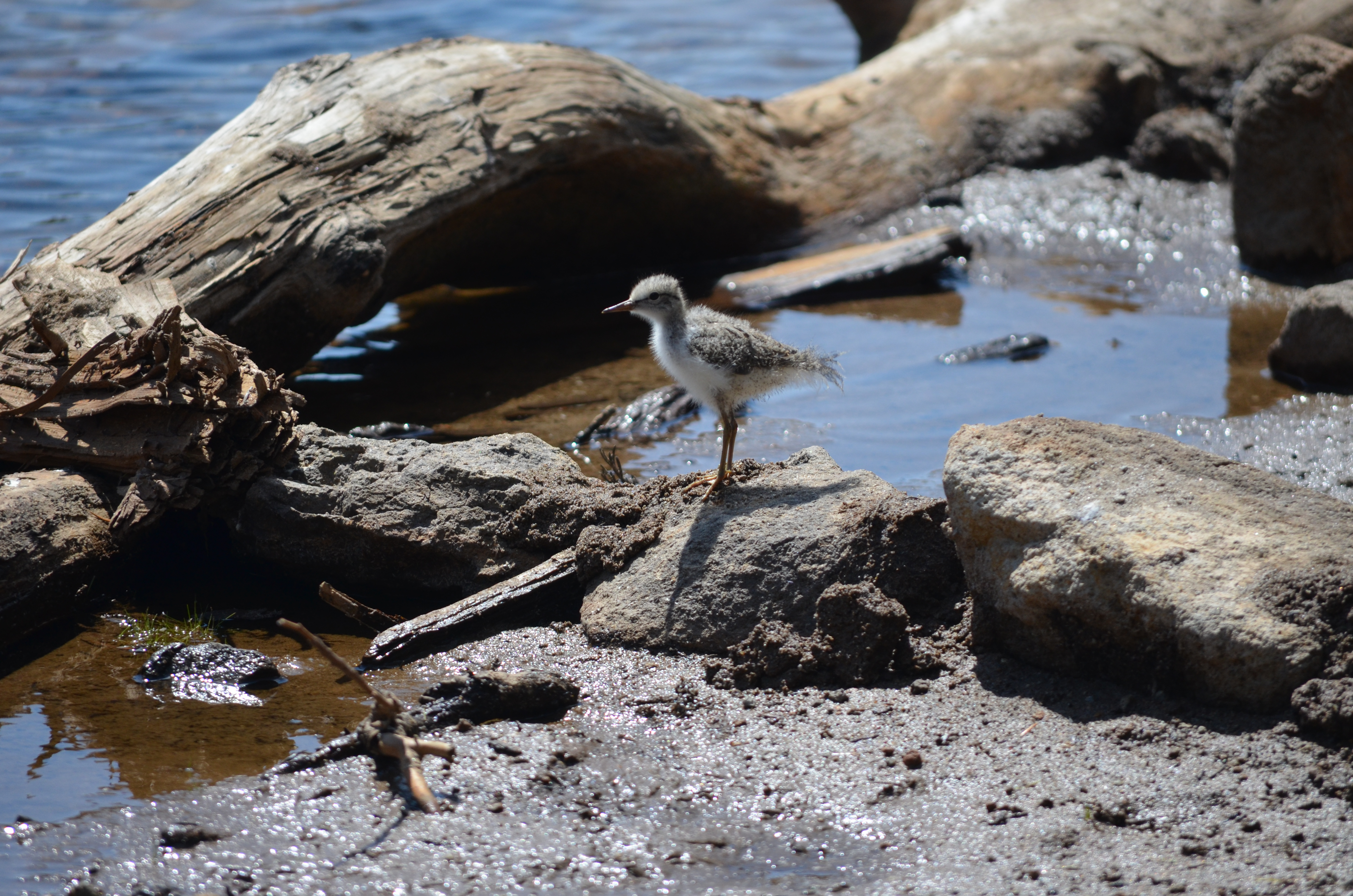 A fuzzy sandpiper chick stands on a rock on the shore of Emerald Lake.