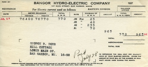 Receipt from Bangor Hydro-electric Company to George B. Dorr for electric current used. Addressed to Dorr's Hill Cottage, Lower Main St., Bar Harbor address. Dated July 17,1937 and paid on July 29,1937.
