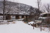 A wayside in the snow in front of the Potomac River, with the B&O Railroad and Maryland Heights in the background.