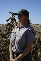 A woman in the National Park Service maintenance uniform stands for a photo. Desert cactus and shrubbery extend into the background meeting white sand dunes under a clear light blue sky.