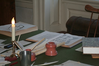 Desk with writing equipment and books located in the aide-de-camp office inside General George Washington's Headquarters.