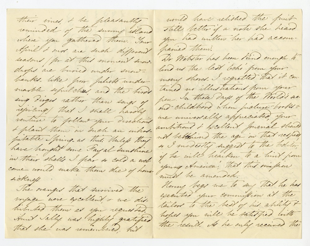 Your various gifts were most welcome. The baskets are exceedingly pretty, & I shall value them not a little for their outre-mer associations & as tokens of your kind remembrance of me. The seeds, likewise, are most acceptable, & if they are brave enough to ‘take the air’ in such a climate as ours, I hope you will, some-day, sit & smoke under the shadow of [p. 2] their vines, & be pleasantly reminded of the sunny island where you gathered them. Your April & ours are such different seasons (for at this moment snowdrops are buried under snow banks – like poor Juliets under marble sepulchers, and the birds sing dirges rather than songs of rejoicing) that I shall hardly venture to follow your directions & plant them in such an inhospitable Spring as this. Unless they have brought some Fayal sunshine in their shells I fear so cold a welcome would make them die of homesickness.