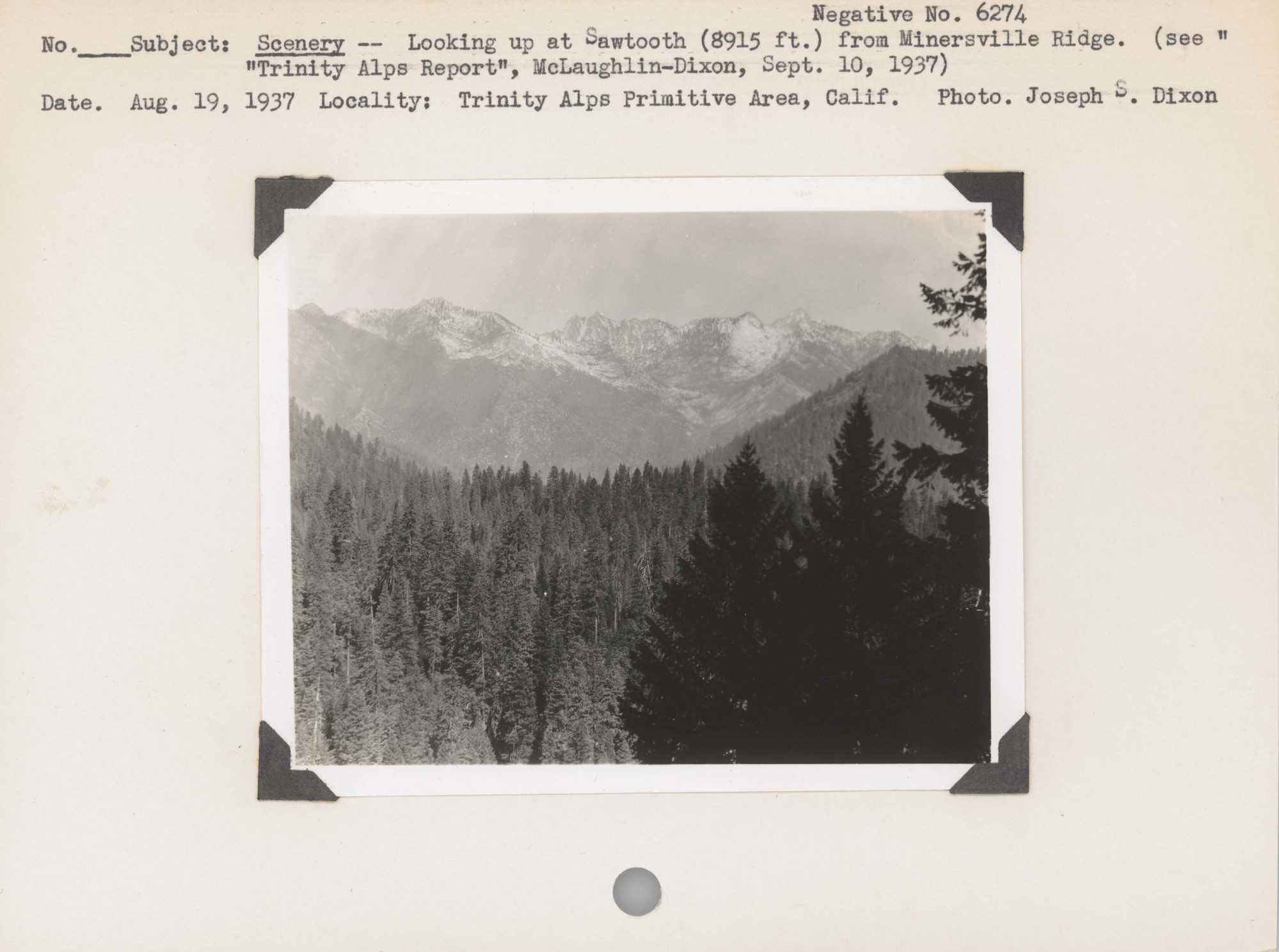 Scenery: Looking up at Sawtooth (8915 ft.) from Minersville Ridge. (See “Trinity Alps Report” – McLaughlin-Dixon, September 10, 1937. Negative #: 6274. Locality: Trinity Alps Primitive Area, California.