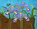 painting of purple, yellow, and white flowers in front of a log with a bee flying over