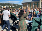 Ada Limon, her brother, and the Superintendent unveil a picnic table in front of a crowd outside in front of a building.