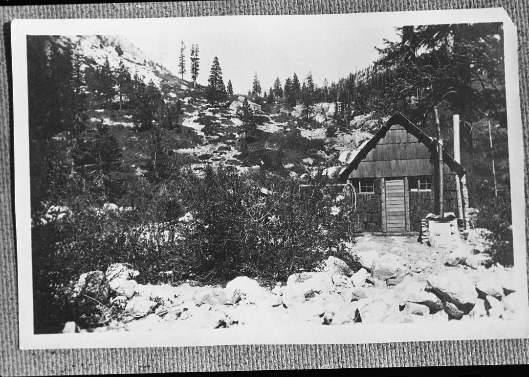 Unknown Photographer, Unknown Date, Junction Meadow on Bubbs Creek, KCNP, Backcountry cabins and structures, Knapp cabin at Junction Meadow built of cut cubes of wood.