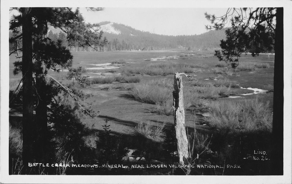 Administrative Collections: Album 3 (Scenics) -Henry Lind photographic postcards of visitors fishing in park, Battle Creek Meadows, Mineral store and garage, and State highway near LAVO. See LAVO PH Coll 26 for complete set of Lind postcards