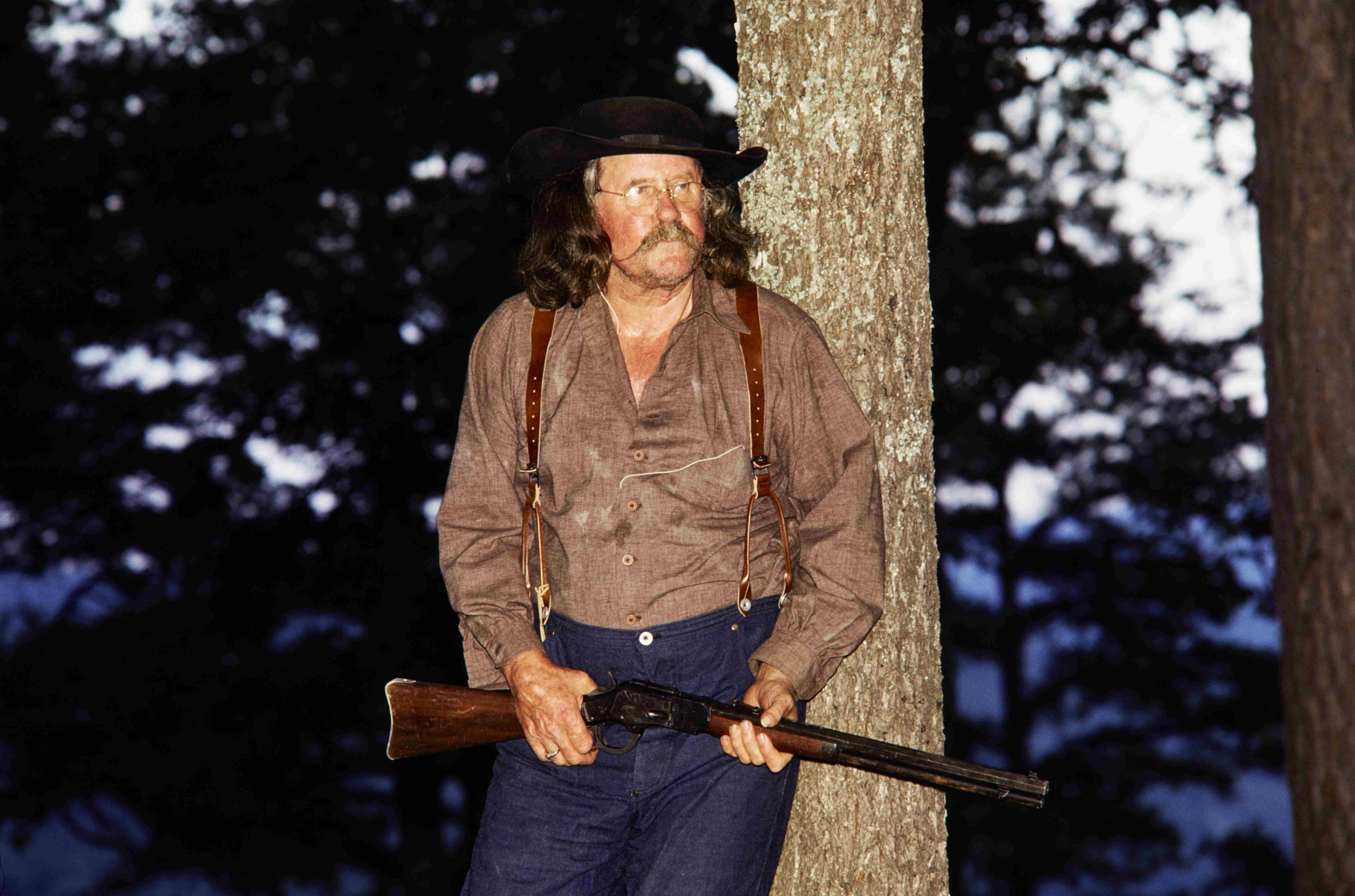 NPS volunteer Stan Laupher holding a agun during "Ol Riverman" program in Buffalo National River.