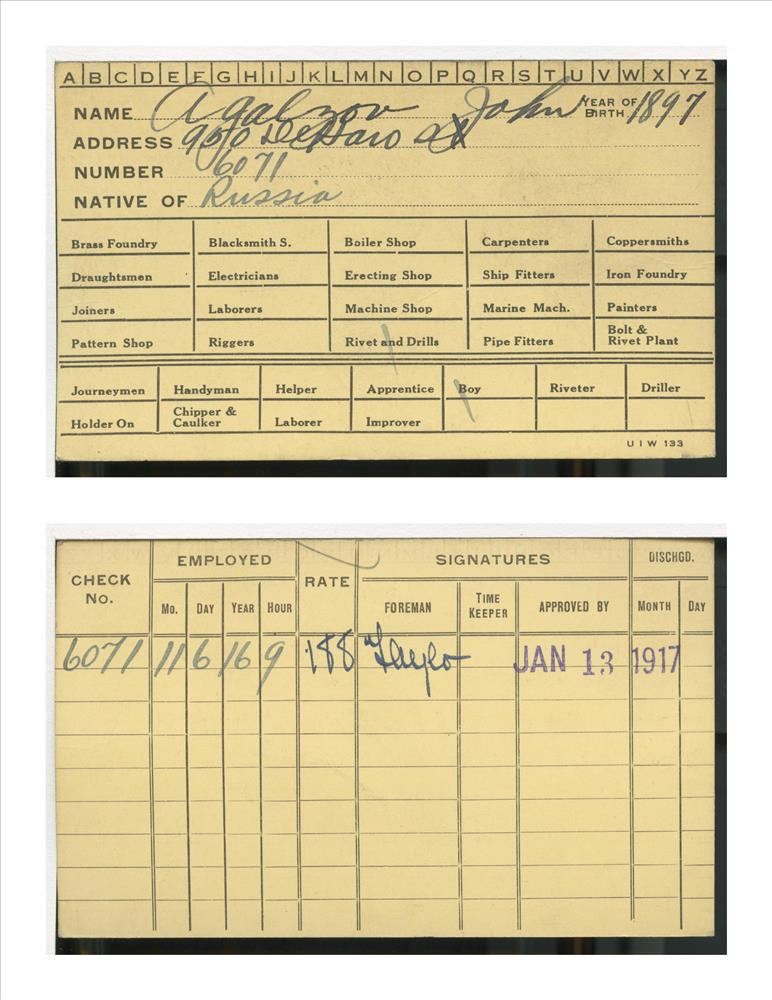 Union Iron Works Co. employee card for John Agalzov