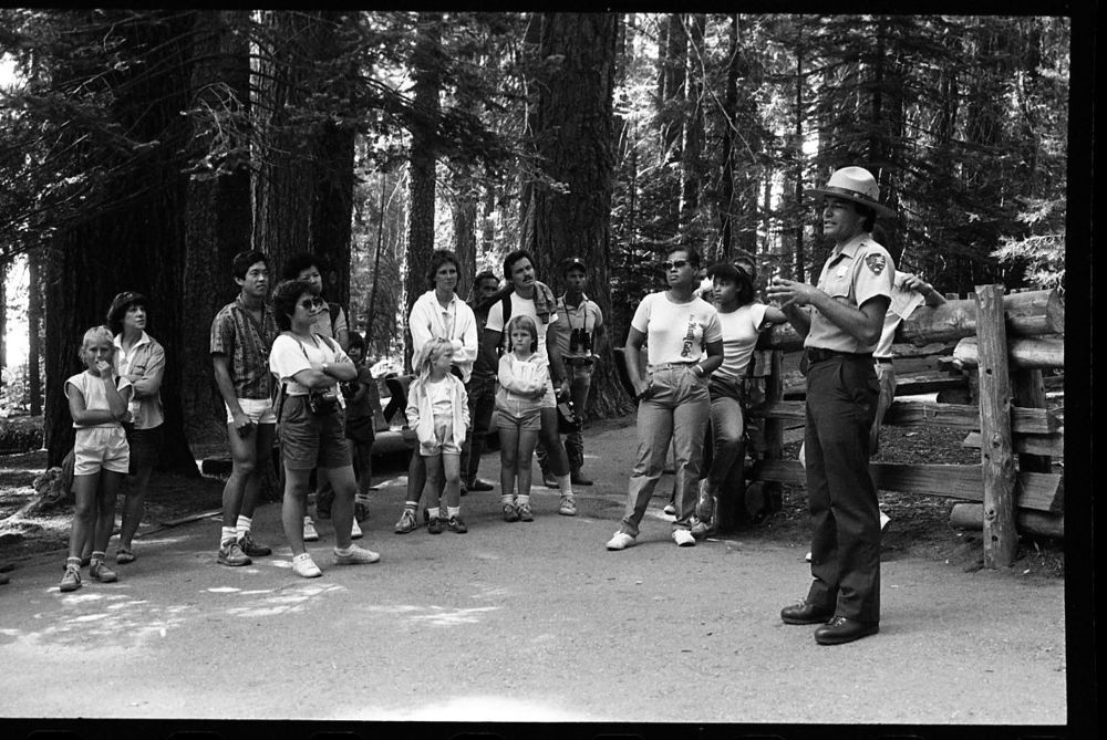 Interpretive Activities, NPS Individuals. Ranger-Naturalist Ken Cottrell talks with a group about the ecology of Giant Sequoias.