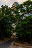 A road leads through the trees to the Mountain Tower, which stands tall behind them.