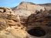 Round pool of water in tan sandstone, with cliffs above it, and blue sky.