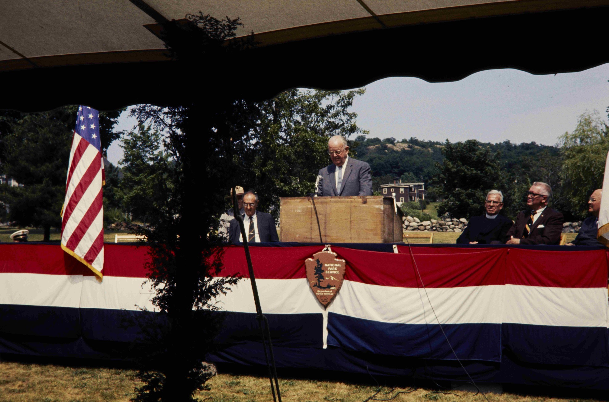 NPS employees on stage for the dedication of Saugus Iron Works National Historic Site.