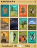 A gameboard with a light brown background titled Lotería show 12 images of: a chunk of petrified wood with clear-colored silica inside a void that has an arrow pointing to it, a hiking trail surrounded by pines that has an exhibit, a tall Ponderosa Pine with dark red bark, three petrified Redwood stumps that are fractured showing the once towering Redwoods above the stumps, a dark brown, gray and tan shale outcrop showing various layers, a landscape covered in volcanic ash with a volcano in the distance, a Latino Park Ranger in NPS uniform holding a pinecone, a vast green valley, a Latina paleontologist at a shale outcrop holding a hand lens, a woodpecker with black, white yellow and red plumage pecking at an aspen tree, different visitors wearing bright colored clothes admiring a petrified Redwood stump from behind a wooden fence, a gray and fluffy Abert squirrel holding an acorn. The bottom of the gameboard is labeled Tabla / Gameboard 3 with a fossil wasp saying "Do Not Cut."
