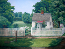 A pastel drawing depicts a white cottage in a park setting with a simple but dignified gravesite in the distant background.