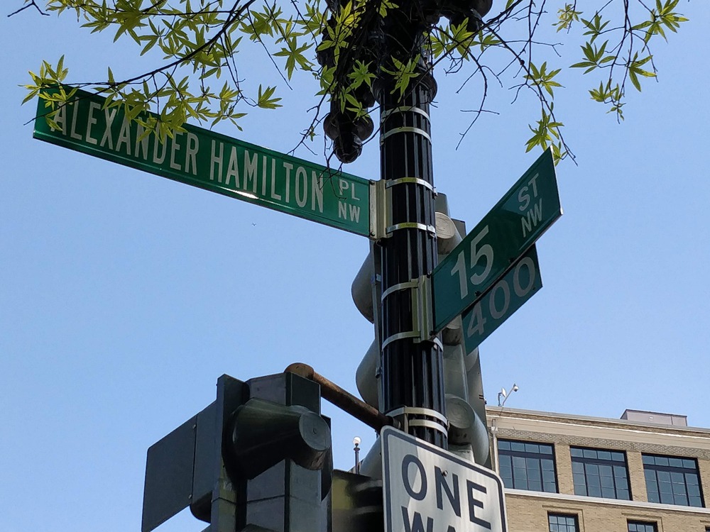 Green street signs for the intersection of 15th Street and Alexander Hamilton Place