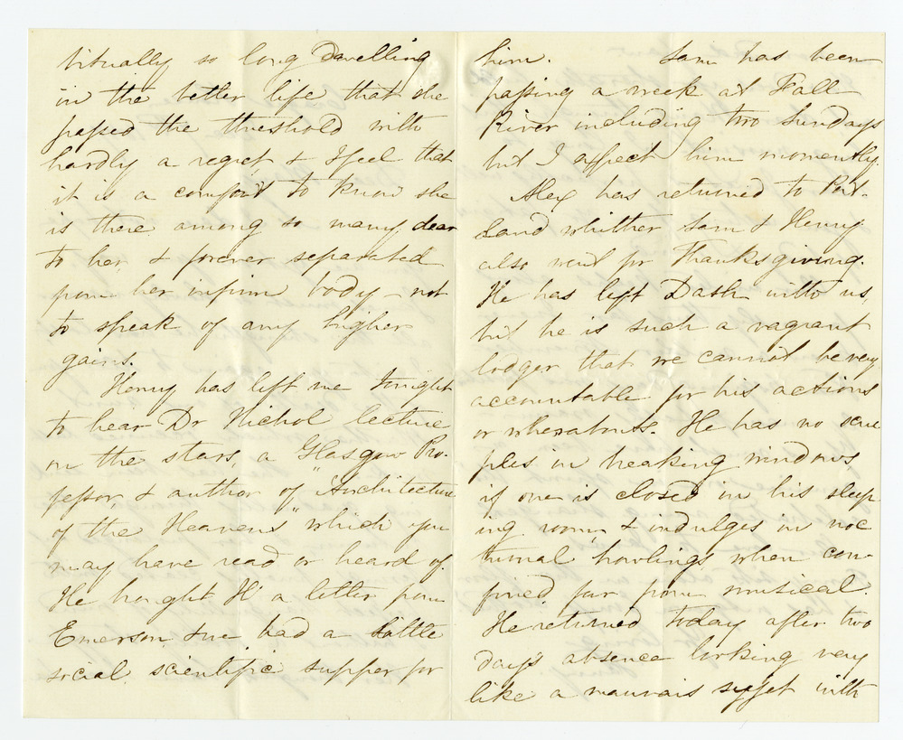 Henry has left me tonight to hear Dr Nichol lecture on the stars, a Glasgow Professor, & author of “Architecture in the Heavens” which you may have read or heard of. He brought H a letter from Emerson, & we had a little social, scientific supper for [p. 3] him. Sam has been passing a week at Fall River including two Sundays but I expect him momently.
