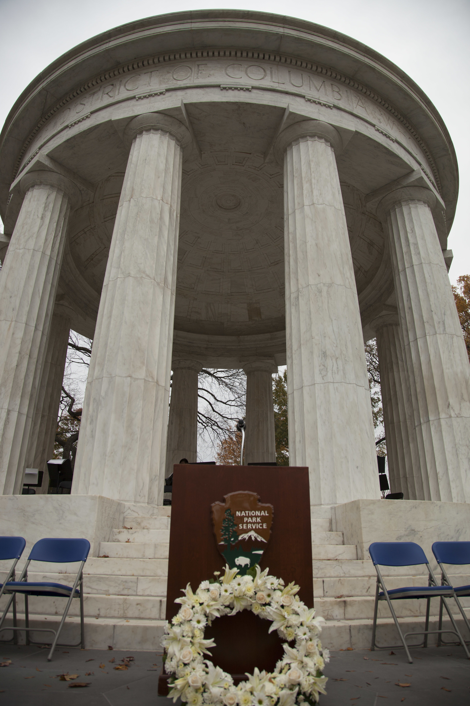 An NPS podium and a wreath stand before a marble memorial, with a circle of tall columns supporting the round, domed top.