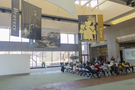 Seated guests in white chairs look and listen to a speaker who is on the far right, while a black and white picture banner of an African-American soldier hangs from the rafters above them all.