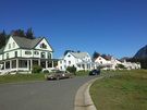 A row of seven three-story, white houses, with wrap around porches and colorfully painted trim.