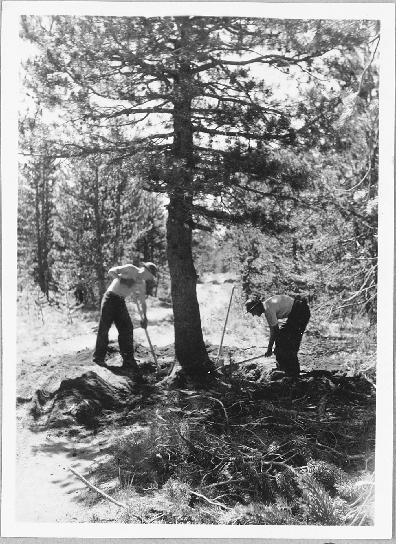 Administrative Collections: Album 5 (Emergency Conservation Works) -Construction of Hat Creek-Badger Flat-Twin Lakes truck trail showing workers clearing road by removing rocks and trees and drilling and blasting rock