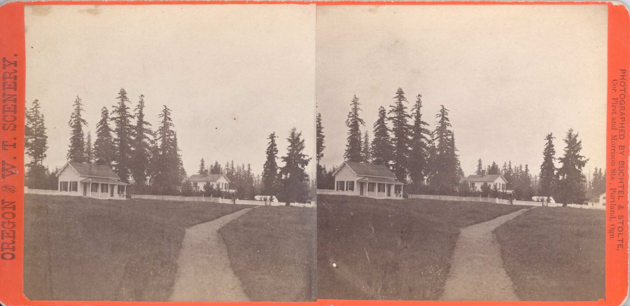 A black and white double stereoscope image with an orange border. Text on the one side of the border reads "Oregon and W.T. Scenery." Text on the other side of the border reads "Photographed by Buchtel & Stolte, Cor. First and Morrison Sts., Portland, Ogn."